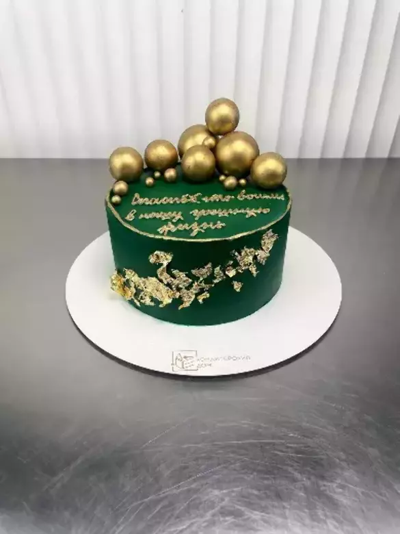 • Декор: Шары из шоколадной глазури, надпись кремом, золотая фольга