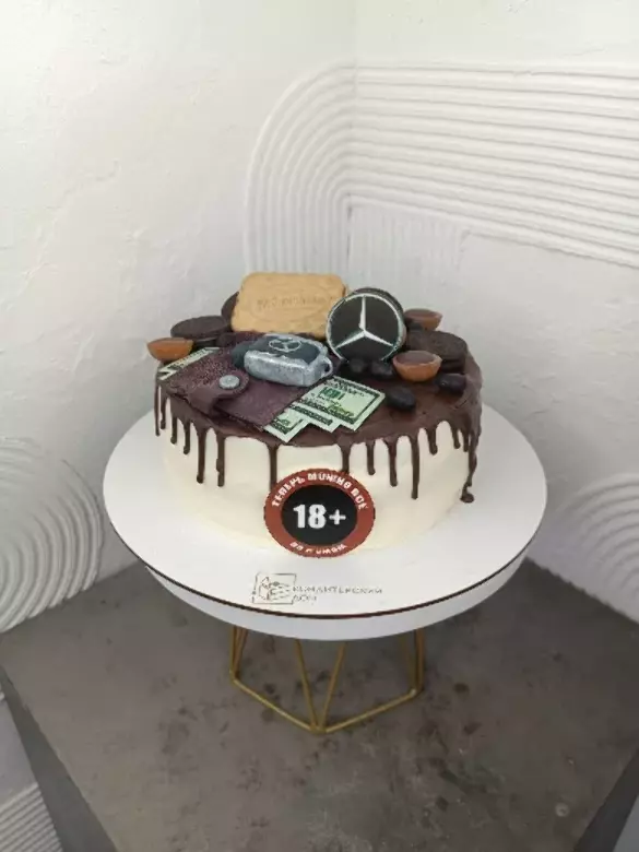 • Декор: Фотопечать на сахарной бумаге, ключ и бумажник из мастики, ассорти сладостей, шоколадные потеки