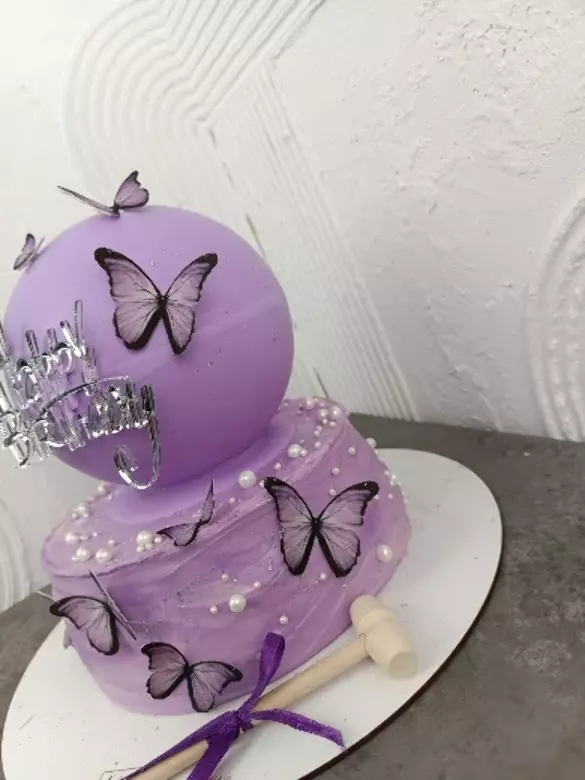 • Декор: Шар из глазури, бабочки на сахарной бумаге, конфетти, теперь, молоточек